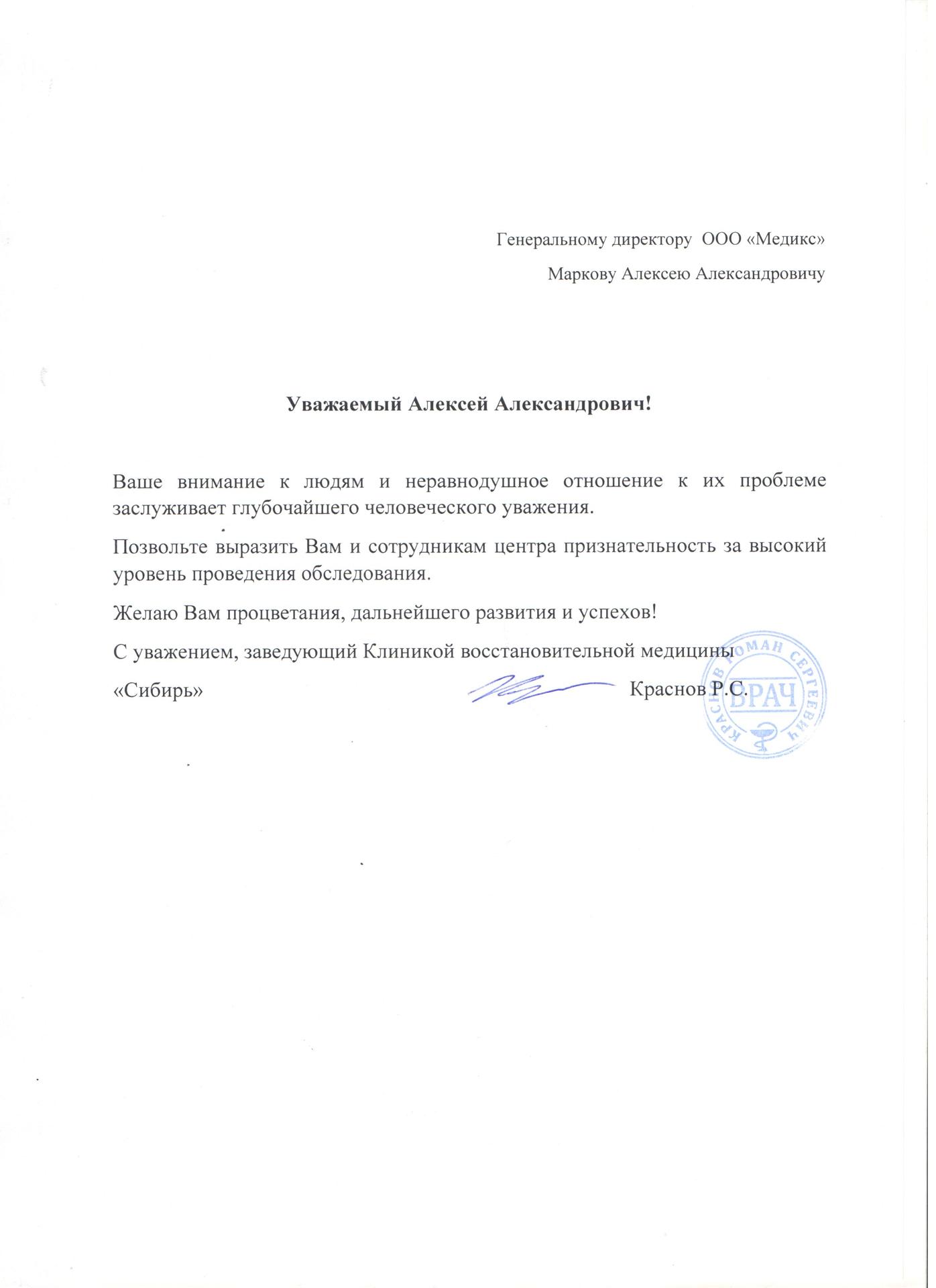 Позвольте выразить Вам и сотрудникам центра признательность за высокий уровень проведения обследования.
