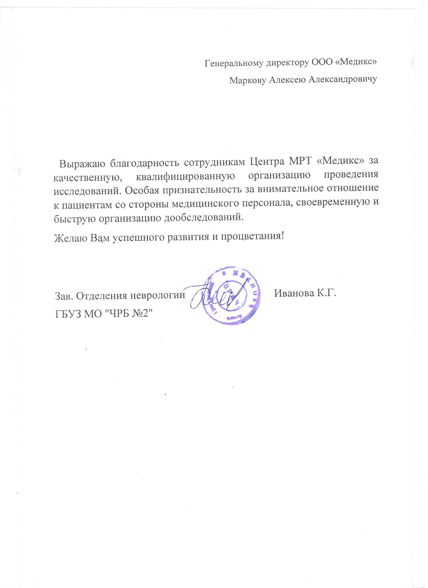 Выражаю благодарность сотрудникам Центра МРТ «Медикс» за качественную, квалифицированную организацию проведения исследований. Особая признательность за внимательное отношение к пациентам со стороны медицинского персонала, своевременную быструю организацию дообследований.